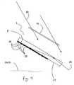 Two basic arrangements are illustrated in figs. 9 and10. (these drawings are not to scale). In comparing theseto fig. 8 it will be noticed that the reference beam (hererepresented by just one ray 26) enters thesubstrate 27 ofhologram 3 by way of a bevelled edge. (It will beunderstood that there are a number of other ways ofcoupling thebeam 26 into the substrate including prismsand diffraction gratings.) The beam then suffers internalreflection and impinges on thesensitive layer 21 where itinterferes with the object light to create a transmissiontype hologram. Fig. 10 illustrates the same configurationbut with thesensitive layer 21 located on the other sideof thesubstrate 27, such an arrangement produces areflection hologram which, for full colour use, should beoperate in three appropriately chosen wavelengths.