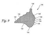 Referring now to FIG. 9, the specific geometry of sealinglip 155 is illustrated in greater detail, as an enlargedview. Sincelip 155 is illustrated as a planar, full sectionview, lines or surfaces which are referred to herein as flat or straight are in fact circumferential or annular surfaces,often cylindrical, as would be understood by recognizing thatfilter seal 141 is symmetrical throughout its annular shape.Sealing lip 155 begins at the end oflower wall 160 belowchannel 154 with concaveradiused surface 163 which has aradius of approximately 12.7 mm.