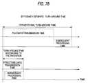 - In contrast, according to the embodiments, the upper limit of throughput varies in response to data amount for each structure of transmission data (see Fig. 76.) Generally, high throughput is required for service for handling large-capacity data. For large-capacity data, the data amount for each structure is also large, thus throughput adaptive to service can be provided. Moreover, the throughput value can be accomplished to about several hundreds of Mbytes/sec even between points tens of thousands of kilometers distant from each other. (See Fig. 77.) Therefore, the embodiments enable high-speed, high-definition print service requiring unprecedented high throughput, for example.