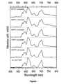 2. Ga2O2:M (M =Cr, Ce, Dy) (Comparative Example)Even though Cr3+ is an ideal dopant for the β-Ga2O3 host interms of charge and size, there is essentially no EL emission observed due toCr3+. The EL spectrum of Ga2O3:1%Cr is the same as that of Ga2O3:1%Ce,which was sputtered in an atmosphere of 5% N2 and 5% O2 in argon andannealed at 950°C in argon. A deep red and near infrared emission in bothcases has also been observed for Ga2O3:Eu as well as in Ga2O3:1%Dy, seeFigure 7, and is thus clearly due to the emission of the β-Ga2O3 host lattice. Itis worth noting that a similar red emission in the room temperaturephotoluminescence spectrum of Ga2O3:Cr was attributed to the4T2 -4A2transition of the Cr3+. However, characteristic Cr3+ emission, especially thesharp R1 (690 nm) and R2 (697 nm) lines reported in the fluorescencespectrum of Ga2O3:Cr (see L.P. Sosman, T. Abritta, O. Nakamura and M.M.F.D'Aguiar Neto, J. Mater. Sci. Lett., Vol. 14, pp. 19-20, (1995)) wasabsent in the EL spectrum. The lack of Ce3+ emission was very likely due tothe existence of stable Ce4+ instead of the desired Ce3+. The Dy3+ emissionappeared as two broad bands at ∼490 and 580 nm, in contrast with itsphotoluminescent emission spectrum of powder specimens wherecomplicated fine structures have been observed even at room temperature.