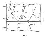 In order to explain the principle of the thin film polarizing device in accordance withthe present invention, it is necessary to first explain the principle of light interference as wellas of frustrated total internal reflection in thin films. This can be done with the help of asimplified thin film system shown in Fig. 1. Without departing from the principle and scopeof the present invention as inclaim 1, the conclusions that can be drawn from the simplified thin filmsystem are also applicable to the design of multilayer thin film coatings for the thin filmpolarizing devices. The thin film system in Fig. 1 is comprised of anincident medium 2having a refractive indexn0, athin film layer 4 having a refractive indexn1 and thicknessd1 and anexit medium 6 having a refractive indexn2. Whenlight beam 1 is incident upon thethin film, some of the incident light is reflected at theinterface 3 between theincidentmedium 2 and thelayer 4, whilst the remaining light is transmitted. The transmitted lightwill be reflected and transmitted at theinterface 5 between thelayer 4 and theexit medium 6.This reflected beam will, in turn, undergo transmission and reflection at theinterface 3between thelayer 4 and theincident medium 2, and so forth. Thus, theincident light beam 1will undergo multiple reflections and transmissions at the twointerfaces 3 and 5. All thereflected and transmitted light beams will interfere with each other. For the sake ofsimplicity, only two reflectedbeams 7 and 8, and two transmittedbeams 9 and 10 are shownin Fig.1. The angles of incidence of the beams at theinterface 3 and theinterface 5 are 0and 1, respectively, 2 is the angle of refraction in theexit medium 6, respectively. Therelationship between these angles is governed by Snell's Law:n0 sin0 =n1 sin1 =n2 sin2