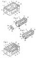 Das in den Fig. 1 - 3 im zerlegten Zustand dargestellteZwischenwirbel-Implantat besteht im wesentlichen aus einem anseiner Deckfläche 11 und Grundfläche 12 offenen, rahmenförmigenKäfig 1 mit zwei je ein Langloch 19 aufweisenden Seitenflächen13 und 14, einer, eine Bohrung 17 aufweisenden Frontwand 15 undeiner Hinterwand 16. Die Form des Käfigs 1 ist bei dieserAusführungsform quaderförmig, sie kann jedoch - wie anhand derFig. 7 und 8 dargestellt - auch keilförmig sein. Der Käfig 1kann entweder einteilig ausgeführt werden, wie in Fig. 1dargestellt oder auch mehrteilig, vorzugsweise zweiteilig, wieanhand der Fig. 7 und 8 erläutert.