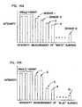 - FIGS. 14A and 14B illustrate exemplary intensity measurements using a cut-off filter arrangement such as illustrated inFIG. 13B, first in the case of a white surface being measured (FIG. 14A), and also in the case of a blue surface being measured (FIG. 14B). As illustrated inFIG. 14A, in the case of a white surface, the neutrally filtered perimeter fiber optics, which are used to detect height and angle, etc., generally will produce the highest intensity (although this depends at least in part upon the characteristics of the neutral density filters). As a result of the stepped cut-off filtering provided by filters having the characteristics illustrated inFIG. 13B, the remaining intensities will gradually decrease in value as illustrated inFIG. 14A. In the case of a blue surface, the intensities will decrease in value generally as illustrated inFIG. 14B. Regardless of the surface, however, the intensities out of the filters will always decrease in value as illustrated, with the greatest intensity value being the output of the filter having the lowest wavelength cut-off value (i.e., passes all visible light up to blue), and the lowest intensity value being the output of the filter having the highest wavelength cut-off (i.e., passes only red visible light). As will be understood from the foregoing description, any color data detected that does not fit the decreasing intensity profiles ofFIGS. 14A and 14B may be detected as an abnormality, and in certain embodiments detection of such a condition results in data rejection, generation of an error message or initiation of a diagnostic routine, etc.