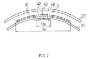 Next,exhaust valves 41 were provided in the lower center ofthe carrying path in the quenching apparatus in a manner similar tothat shown in Fig. 7 to partially modify the curvature of the glasssheet. The length of theexhaust valve 41 in the direction of thewidth of the carrying path (41a in Fig. 7) was 100 mm, correspondingto 20% of the width of the glass sheet (3a in Fig. 7).Rods 42 werepositioned so that the restriction of the exhaust was reduced asapproaching the end portions from the central portion. The exhaustvalves were placed in the exhaust inlets of the quenching apparatus,in the first to the fourth rows on the most upstream for carrying theglass sheet, in a manner similar to that shown in Fig. 5.