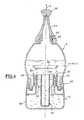 Le flacon 6 est ouvert à sa base, laquelle est constituée par un premier colcylindrique 14 portant un filetage externe 16. Le col 14 est raccorde au corpsde flacon 6 par un épaulement 18. Un second col 20, de diamètre plus petitque le diamètre du premier col, est disposé sur l'extrémité opposée à cedernier. Le second col 20 est pourvu d'un filetage externe 22 sur lequel estvissé un embout de distribution 24 fermé, dont la pointe 26 peut être casséepour la création d'une ouverture au moment de l'utilisation, en vue d'appliquerle produit.The
