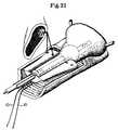 Retrievingend 65 further comprises areturn leg 71 which extends awayfromsharp tip 70 in the same direction ofshaft 69.Shaft 69,return leg 71 andthe underside ofsharp tip 70 thus create an inverted U-shaped region capableof ensnaringsuture 10 for retrieval purposes. The distance betweenreturn leg71 andshaft 69 in the region of the inverted U-shape is preferably approximatelythe same diameter assuture 10. In this fashion, and as shown in Fig. 20, aftersharp tip 70 has penetrated the periurethral tissue adjacent the vagina in orderto enter the space of Retzius, the inverted U-shape may be pulled downwardlyover a suture tail, thereby snaring the suture.Metal retrieving end 65 may thenbe pulled back through the periurethral tissue, and the tail ofsuture 10 willremain snared betweenreturn leg 71 andshaft 69 directly beneathsharp tip 70. Although the suture tail will slide within the U-shaped region, it will neverthelessbe pulled into the vagina.
