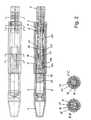 Das Mischglied 10 und das Abtriebsglied 20 bilden in einem innerhalb des BehältnissesB angeordneten Bereich eine Dosiereinrichtung. Das Mischglied 10 ist hierfür in einemhinter dem ersten Kopplungsmittel 13 befindlichen Innenmantelbereich mit einer Ausnehmungversehen. Die Ausnehmung weist zwei sich in Vorschubrichtung erstreckendeNuten 11 und 12 auf, die winkelversetzt parallel nebeneinander angeordnet sind. DieNuten 11 und 12 sind in Vorschubrichtung unterschiedlich lang. Die kürzere Nut 11 istals Sacknut in der Mantelfläche ausgebildet, und die längere Nut 12 wird in Vorschubrichtungdurch den hinteren Steg der Aufnahme für das dritte Kopplungsmittel 25 begrenzt.An Ihren rückwärtigen Enden münden die Nuten 11 und 12 auf gleicher Höhe inBezug auf die Vorschubrichtung in einer Verbreiterung der Ausnehmung aus, wie ambesten in Zusammenschau des Längsschnitts mit den Schnitten C-C, D-D und E-E zuerkennen ist. Die Verbreiterung der Ausnehmung reicht bis zur hinteren Stirnfläche desvorderen Hülsenbereichs des Mischglieds 10. Die dort auslaufenden, einander gegenüberliegendzugewandten Seitenwände der Verbreiterung werden je durch eine der beiden Nuten 11 und 12 in Vorschubrichtung verlängert.The mixing