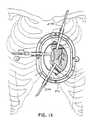 - In particular, a surgical retractor assembly may be used to separate the ribs atthe site of the incision as shown in FIG. 13. Specifically, abase 270 is placed on thechest of the patient with the central opening defined by the base being positionedover the operative site.Retractor assemblies 272 are mounted to the base at variouslocations. Each ofretractor assemblies 272 includes a blade having a hook to engageeither a rib or the sternum therewith. The retractor assemblies are mounted and usedto retract ribs until a sufficiently large opening in the chest cavity is defined toprovide direct access to the heart. For example, the sternum and the fourth and fifthribs can be split apart to create a window. Other configurations of spreading the ribsand/or selectively cutting individual ribs away from the sternum may also be utilizedfor a particular procedure. Once the desired access to the heart is achieved, the graftvessel, e.g., the internal mammary artery (IMA) is dissected from the surroundingcartilage and muscle, in a free end of the vessel is exposed. The occluded coronaryartery, e.g., the left anterior descending artery (LAD), is then prepared for receivingthe IMA graft. The heart is positioned in the desired orientation either by tractionsutures passing through the pericardium or by manipulation with heart manipulationinstruments which are held by the surgical personnel or clamped in a fixedorientation to a base such as the retractor assembly base. One such heartmanipulating instrument is available from United States Surgical Corporation ofNorwalk, Connecticut. Blood flow through the LAD can be restricted bycardiopulmonary bypass and pericardial cooling. Alternatively, a damping instrument may be applied directly on the LAD to restrict blood flow and reducemovement of the heart near the LAD. Such a heart stabilizing instrument is alsoavailable from United States Surgical Corporation of Norwalk, Connecticut.