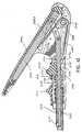 - A firing safety mechanism is also provided to prevent premature firing ofsurgical instrument 100. In the illustrated embodiment, the firing safety assemblyincludes aninverted leaf spring 250 having a cut-outportion 252 formed thereinwhich biases against ashoulder 254 formed onactuator rod 232.Spring 250 isfurther provided with ahook portion 256 formed at the proximal end thereof whichlatches onto a protrudingsurface 258 formed in housing half-sections 212a and 212b.In this manner,spring 250 prevents distal movement ofactuator rod 232 when thesafety mechanism is armed. Asafety release slide 260 which includes an upwardlyextending contact surface which is exposed from the upper surface of housing half-sections212a and 212b to permit the user to operate the slide and forms a clevis on alower portion thereof which receives a flattened section 266 ofactuator rod 232.Safety release slide 260 is further provided with acamming surface 268 along thelower edge thereof which cams thespring 250 out of contact withshoulder 254 uponproximal movement ofsafety release slide 260.