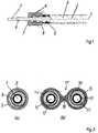 Fig. 2b gibt den Querschnitt durch ein Hybridkabel wieder, das zwei Lichtwellenleiter mitden optischen Fasern 10, 11 umfaßt. Sie befinden sich jeweils in einer Schutzhülle 12, 13und sind in Metallrohren 14, 15 angeordnet. Beide Rohre 14, 15 werden von einergemeinsamen Isolierung 16 umschlossen. Eine Engstelle 17 mit einer Kerbe 18 ermöglichtdie einfache Trennung beider Lichtwellenleiter. Mit dem dargestellten Hybridkabel könneneiner angeschlossenen elektrooptischen Komponente unterschiedlicheVersorgungsspannungen über die beiden gegeneinander isolierten Rohre 14, 15 zugeführtwerden. Dabei gestatten es die beiden Fasern 10,11, zwei voneinander unabhängigeSysteme zur optischen Datenübertragung vorzusehen, beispielsweise um die Sicherheit zuerhöhen.Fig. 2b shows the cross section through a hybrid cable with two optical fibersthe