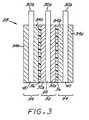 The negativecurrent collector 38 and its negative electrodeactive material32a, the positivecurrent collector 40 and its positive electrode active material 34a,theseparator 36, and the electrolyte may be made of any operable materials andhave any operable physical arrangement. A wide variety of operable materialsand physical arrangements are known in the art. The preferred approach of thepresent inventor for these elements is that developed by Bell CommunicationsResearch (Bellcore), and described, for example, in US Patents 5,470,357,5,456,000, and 5,429,891, whose disclosures are incorporated by reference. Thepresently most preferred dimensions and materials of construction of theseelements are a 0.002 inch thicknegative electrode 32 made of a copper negativecurrent collector 38 with a thin film on each side thereof of carbon-containingnegative electrodeactive material 32a made of carbon particles in a polymerbinder that is porous to the electrolyte, preferably polyvinylidene fluoride; a 0.002inch thickpositive electrode 34 made of an aluminum positivecurrent collector40 with a thin film on each side thereof of LiCoO2-containing positive electrodeactive material 34a made of LiCoO2 particles and conductive carbon particles ina polymer binder that is porous to the electrolyte, preferably polyvinylidenefluoride; 0.002 inchthick separators 36 made of a hybrid polymer of silicaparticles in a polymer binder that is electrically nonconducting but is porous to theelectrolyte, preferably polyvinylidene fluoride; and an electrolyte of 1 molar LiPF6in a 2:1 mixture by volume of ethylene carbonate and dimethyl carbonate. (Asused herein, reference to a metal includes the pure metal and its alloys, unlessotherwise indicated. That is, "copper" includes pure copper and alloys of copper.)These dimensions and materials of construction are presented by way ofillustration of the preferred embodiment and are not limiting of the invention,which is applicable to other forms of lithium-ion battery cells as well.