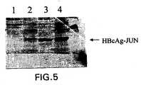 - The lysate was then centrifuged for 30 minutes at 12,000 x g in order to remove insoluble cell debris. The supernatant and the pellet were analyzed by Western blotting using a monoclonal antibody against HBcAg (YVS1841, purchased from Accurate Chemical and Scientific Corp., Westbury, NY, USA), indicating that a significant amount of HBcAg-JUN protein was soluble (Fig. 5). Briefly, lysates fromE. coli cells expressing HBcAg-JUN and from control cells were centrifuged at 14,000 x g for 30 minutes. Supernatant (= soluble fraction) and pellet (= insoluble fraction) were separated and diluted with SDS sample buffer to equal volumes. Samples were analyzed by SDS-PAGE followed by Western blotting with anti-HBcAg monoclonal antibody YVS 1841. Lane 1: soluble fraction, control cells; lane 2: insoluble fraction, control cells; lane 3: soluble fraction, cells expressing HBcAg-JUN; lane 4: insoluble fraction, cells expressing HbcAg-JUN.