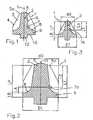 Fig. 2 zeigt ein zu Fig. 1 analoges Vorderteil 1 und dessen für die Erfindung wesentlichen Maße. Danach bezeichnet ein Maß L0 die Länge des Eindringabschnitts 2 zwischen dem Endabschnitt 5 und dem Auslauf 8, L1 die Länge des Vorderteils 1 zwischen dem Endabschnitt 5 und der Stirnfläche 10, LP die Profillänge, die sich aus der Summe der Länge L0 und der Länge LA des Auslaufs 8 ergibt, und LB die Länge des Basisabschnitts 9, so daß LP + LB = L1. Für die Länge LA des Auslaufs 8 folgt daraus LA = L1 - L0 - LB = LP - L0). Alle Längen werden dabei in Richtung der Längsachse 11 (Fig. 2) gemessen. Außerdem zeigt ein Vergleich der Fig. 1 bis 3, in denen gleiche Teile mit demselben Bezugszeichen versehen sind, daß diejenige Stelle 7, 7a bzw. 7b an der die konischen Bereiche der Nutenböden 6 des Eindringabschnitts 2 enden und in den Auslauf 8 übergehen, in Fig. 1 in gleicher Höbe mit den unteren Ender der Oberkanten 4 der Stege 3 liegt, während die entsprechende Stelle 7a bzw. 7b in Fig. 2 unterhalb und in Fig. 3 oberhalb des unteren Endes der Oberkanten 4 liegt. Das ist eine Folge davon, daß normalerweise sowohl ein Maß D1, das den Durchmesser des Vorderteils 1 am Ende der Länge L1, d. h. im Bereich des Basisabschnitts 9 bzw. der Stirnfläche 10 angibt, als auch die Kegelwinkel, unter denen die Oberkanten 4 der Stege 3 und die Nutenböden 6 verlaufen, durch Normen oder dgl. vorgegeben sind. Die Oberkanten 4 enden daher nach unten hin jeweils dort, wo sie einen gedachten Umfangszylinder des Basisabschnitts 9. schneiden. Schließlich bezeichnet d0 den Durchmesser am Ende der Länge LO, d. h. an den Stellen 7, 7a bzw. 7b.Fig. 2 shows an analogous to Fig. 1