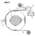 Eine weitere Variante des Verfahrens ist in Fig. 6 dargestellt.Ein flexibler Träger (9) wird nach Verfahren, wie sie aus demStand der Technik bekannt sind, z.B. aus einem Materialreservoir(10) mit einem Auftragswerk (11) mit einem durch Strahlung(UV, Elektronenstrahl) vernetzbaren Material beschichtet. Derbeschichtete flexible Träger (12) überträgt das Material kontinuierlichauf einen rotierenden, zylindrischen Kern (1). Dortwird das Material UV-vernetzt oder mittels Elektronenstrahl gehärtet(4). Dieses kontinuierliche Beschichtungsverfahren führtzu einem Schichtpaket in Form einer Rolle. Der von der Beschichtungbefreite Träger (9) kann entweder als Endlosbandständig sofort wiederverwendet werden oder, wie in Fig. 6 dargestellt,von Rolle zu Rolle durchlaufen.Another variant of the method is shown in FIG. 6.A flexible carrier (9) is made according to the method from theAre known in the art, e.g. from a material reservoir(10) with an order work (11) with a radiation(UV, electron beam) crosslinkable material coated. Thecoated flexible carrier (12) transfers the material continuouslyon a rotating, cylindrical core (1). Therethe material is UV crosslinked or hardened using an electron beam(4). This continuous coating process resultsto a shift package in the form of a roll. The one from the coatingexempted carrier (9) can either be an endless beltcan be reused immediately immediately or, as shown in Fig. 6,run from roll to roll.