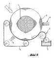 Der Auftrag des Materials gemäß Fig. 1 erfolgt beispielsweiseauf der Außenseite eines rotierenden Zylinders als Träger mittelseines Auftragswerks. Schematisch ist dieser Vorgang in Fig. 4 a dargestellt. Analog ist der Auftrag auf die Innenseiteeines Zylinders als Träger möglich. Ist die Umlaufzeit des unverfestigtenMaterials auf dem Zylinder größer als die zur Verfestigungbenötigte Zeit, kann die Verfestigung kontinuierlicherfolgen und es entsteht ein rollenförmiges Schichtpaket. Istdie Umlaufzeit des unverfestigten Materials auf dem Zylindergeringer als die Verfestigungzeit, so erfolgt der Materialauftragdikontinuierlich, nach Auftrag eines Zylinderumfangs unverfestigtenMaterials erfolgt die Verfestigung, nach der Verfestigungerfolgt der nächste Auftrag eines Zylinderumfangs unverfestigtenMaterials usw.. Es entsteht statt eines rollenförmigenSchichtpackets ein ringförmig aufgebautes Schichtpaketwie in Fig. 4b dargestellt. Der Auftrag des Materials auf derInnenseite eines Zylinders kann in der schon beschriebenen Weiseerfolgen, er kann aber auch durch einen Spritzvorgang, gefolgtvon Nivellierung des Materials durch die Zentrifugalbeschleunigungerfolgen.The application of the material according to FIG. 1 takes place, for exampleon the outside of a rotating cylinder as a carriera commissioned work. This process is schematic inFig. 4 a shown. The order on the inside is analogousa cylinder as a carrier possible. Is the orbital period of the unsolidifiedMaterial on the cylinder larger than that for solidificationtime required, the solidification can be continuoustake place and a roll-shaped layer package is created. isthe round trip time of the unconsolidated material on the cylinderless than the solidification time, the material is applieddiscontinuous, after application of a cylinder circumference unconsolidatedSolidification takes place after the solidificationthe next order of a cylinder circumference is unconsolidatedMaterials etc. It is created instead of a roll-shaped oneLayer packets are a ring-shaped layer packetas shown in Fig. 4b. The order of the material on theInside of a cylinder can in the manner already describeddone, but it can also be followed by a spraying processof leveling the material by centrifugal accelerationrespectively.