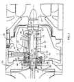 Anannular seal gland 74 is positioned concentrically around a section oftheshaft 16 adjacent the bearing inner race 62. The seal gland is interposedaxially between acompressor backplate 76 and theshaft housing 14 and is fixedaxially therebetween by attachment between the compressor backplate and shafthousing. The seal gland includes an axially-facingsurface 78 that is positionedagainst an axially-facing surface of the thrust element 54 to provide a thrustsurface pair. Axial end surfaces of both the damper enlarged diameter section 48and bearing outer race 66 do not extend axially a sufficient distance to contact theseal gland axially-facingsurface 78, thereby not forming thrust surfacestherewith. With this in mind, shaft thrust loads from the compressor aretransmitted by the shaft to the seal gland, which is transmitted to the thrustelement by its contact with the seal gland the axially-facingsurface 78. Thethrust element 54 acts to absorb the thrust load by its fixed axial placement withintheshaft housing 14. Theseal gland 74 includes an annular sealing ring 80,disposed circumferentially around a gland outside diameter, that is interposedbetween adjacent gland compressor backplate surfaces to form a leak-tight sealtherebetween.
