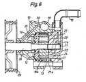 Asupport pin 17 positioned in parallel with thepump shaft 26 is retainedat its opposite ends on theend wall member 11 andside plate 12 and is engagedwith an internal surface ofcylindrical adaptor 13 at a portion of its outerperiphery. Thecam ring 21 is formed at a portion of its outer periphery with anaxial recess 21a for engagement with thesupport pin 17 such that thecam ring 21is movable in a radial direction. At a portion diametrically opposed to theaxialrecess 21a, the outer periphery ofcam ring 21 is sealed by slidable engagementwith aseal member 50 of tetrafluoroethylen which is backed up and disposed inan axial groove formed on the internal surface ofcylindrical adaptor 13.Formed between thecylindrical adaptor 13 andcam ring 21 are first andsecondaction chambers 51a and 51b which are subdivided by thesupport pin 17 andseal member 50 and opposed to one another in a movement direction ofcam ring21. Aplug 18 located at the side of thesecond action chamber 51b is threadedinto the peripheral wall ofhousing 10 in the movement direction ofcam ring 21. Athrust piston 27 is slidably disposed in an internalcylindrical portion 18a ofplug 18 for movement in an axial direction and loaded by acoil spring 28 in theaxial direction ofpump shaft 26. Aninward projection 27a ofthrust piston 27is penetrated through a peripheral wall of thecylindrical adaptor 13 in a liquid-tightmanner and engaged with the outer periphery ofcam ring 21 to resilientlybias thecam ring 21 toward thefirst action chamber 51a in such a manner as tomaximize an eccentric amount ofcam ring 21 relative to therotor 22.