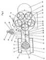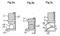 Zu der Kapseltransporteinrichtung, die den Kapselmitnehmer 23 betätigt, gehörenein Kapseltransport-Antriebsmotor 32 mit einem Getriebe 31, siehe Figur 1,an dem eine Antriebsscheibe 37 mit einem Antriebszapfen 38 angebracht ist.Der Antriebszapfen 38 greift in einen Antriebszapfenschlitz 39 eines Antriebshebels24 ein, der unterhalb der Ebene der Magazinscheibe 17 angeordnet istund dort an seinem den Antriebszapfenschlitz 39 entgegengesetzten Ende einenKapselmitnehmerschlitz 40 aufweist. In den Kapselmitnehmerschlitz 40greift ein Mitnehmerzapfen 26 des Kapselmitnehmers 23 ein. An seinem, demAntriebszapfenschlitz benachbarten Ende ist der Antriebshebel 24 um ein Drehlager25 schwenkbar gelagert, so daß er die in Figur 2 gezeigten bzw. mit unterbrochenenLinien angedeuteten Stellungen A, B und C einnehmen kann, wobeisind: