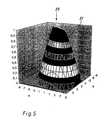 Fig. 5 veranschaulicht in einer perspektivischen Darstellung 30 den graphischen Funktionsverlauf des Skalierungsfaktors 31, wobei im Ausführungsbeispiel für die Parameter α und K die Werte α=1 bzw. K=8.6023 gewählt wurden und der Deformationsvektor mit seinen Anfangspunktkoordinaten (-2, -2) und seinen Endpunktkoordinaten (3, 5) definiert ist.5 shows in a perspective view 30 the graphical function curve of the