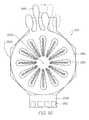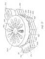 PRINTHEAD AND CAPPER CONSTRUCTION- The construction and arrangement of theprinthead 1120 andcapper 1183 are shown in figures 16 to 24 inclusive. Theprinthead 1120 is an assembly of fourlayers 1302, 1304, 1306 and 1308 of a semiconductor material.Layer 1306 is a layer of electrically active semiconductor elements, including MEMSink ejection nozzles 1310.Layer 1306 has been constructed using standard semiconductor fabrication techniques.Layers 1302 and 1304 are electrically inactive in the printhead and provide passageways to supply the ink to theink ejection nozzles 1310 from theink inlets 1182. Thelayer 1308 is also electrically inactive and forms a guard withapertures 1312 above eachink ejection nozzle 1310 to allow ink to be ejected from the printhead. Thelayers 1302, 1304 and 1308 need not be the same material as thelayer 1306 or even a semiconductor but by using the same material one avoids problems with material interfaces. Further, by using semiconductor material for all components the entire assembly may be manufactured using semiconductor fabrication techniques. Theprinthead 1120 has fourink inlets 1182 and theink ejection nozzles 1310 are arranged into twelve sets, each of which extends roughly radially outwards from thecenter 1300 of the printhead. Every fourth radial line ofink ejection nozzles 1310 is connected to the same ink inlet. Ink ejection nozzles connected to the same ink inlet constitute a set of ink ejection nozzles. Theink ejection nozzles 1310 are arranged on alternate sides of a radial line, which results in closer radial spacing of their centers. The twelve "lines" ofink ejection nozzles 1310 are arranged symmetrically about thecenter 1300 of the printhead, at a spacing of 30°. It will be appreciated that the number of "lines" ofink ejection nozzles 1310 may be more or less than 12. Similarly there may be more or less than fourink inlets 1182. Preferably there are an equal number of lines for eachink inlet 1182. If a single ink is used in the cartridge the ink inlets need not feed equal numbers of "lines" of ink ejection nozzles.