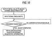 - In addition, in the case that variation in the frequency characteristic is caused due to variation in the circuit elements, as shown in a flowchart of FIG.10, variation in the frequency of the filter is absorbed by detecting errors, which are deviated from the predetermined standard values of the frequency characteristic of the channel selecting filter, in respective receiving states of GSM and W-CDMA at the time of adjustment in the factory, and then replacing corrected values after adjustment with the standard values as respective initial values, which are setting information to control the gm amplifier, to correct the frequency characteristic.
