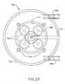 - Figure 23 is a top view of a further alternate centrifuge similar to the centrifuge ofFigure 19 but including internal, separate bearing members (illustrated as four cam followers) that allows the inclusion of guide shaft to be cut through portions of the centrifuge for positioning of the centrifuge tube (or umbilical cable).