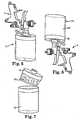 - To use thepot 40, thelid 42 andfilter mesh 45 are removed from thecontainer 41which is then filled with paint (care being taken that theair hole 44 in the base ofthe container is closed). It is unnecessary to strain the paint when it is put into thecontainer 41 and, as described above, it is possible to mix the paint in the containerthereby avoiding the need for a separate receptacle for that purpose. Thelid 42 andmesh 45 are then put back in position on thecontainer 41, thelid 42 is attached tothe (inverted)spray gun 1 which is then returned to its normal position, and theairhole 44 in the base of the container is opened. Thespray gun 1 can now be used inthe usual way. On completion of the spraying operation, theair hole 44 is closed-offagain, thepot 40 is detached from thegun 1 and may then be discarded leavingonly the gun to be cleaned. Before thepot 40 is detached, thespray gun 1 can bere-inverted and thetrigger 5 of the gun operated to allow excess paint remaining inthe gun to drain back into the pot. In either case, if sufficient paint remains in thepot 40, the pot could be re-sealed (instead of being discarded) and used again.