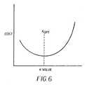 Once all of the cost attributes have been computed, the total costfor a CMYK code value combination is computed by summing up all of the termsin the cost function. In a preferred embodiment, the total cost will include at leasta volume cost term and an image noise cost term according toCost(C,M,Y,K) = αVcost(C,M,Y,K) + βNcost (C,M,Y,K)where the weights α, β may be adjusted to indicate the relative importance ofvolume and noise in the image. Thus, the preferred CMYK code valuecombination to reproduce a desired output color is chosen as the one thatminimizes the cost function, as depicted in FIG. 6. A convenient way to organizethe candidate CMYK code value combinations is to sort them by the K code value. FIG. 6 shows (for one desired output color) the cost of each candidate CMYKcode value combination plotted against the K code value. The preferred CMYKcode value combination has a K value of Kopt, which corresponds to the minimumof the cost function.