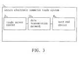 Prior to the secure electronic commerce trade, a trade server encryption/decryption module20 of thetrade server center 2 records the hardware serial numbers S33, S43, and the userinformation m3, m4 of theuser end devices 3, 4, respectively, while the procedure of secureelectronic commerce trade is initiated. When the procedure of electronic commerce trade isinitiated, the encryption/decryption modules encrypt the public keys Key31, Key41, thehardware serial numbers S33, S43, and the user information m3, m4 of theuser end devices 3, 4into files 34, 44 via the asymmetrical single function encrypting method Ea using the public key Key21 of thetrade server center 2. The public key Key21 of thetrade server center 2, in this case,encrypts the file 34=Ea-3(Key31+S33+m3) via the asymmetrical single function encryptingmethod, whereas the public key Key21 of thetrade server center 2 encrypts the file 44=Ea-4(Key41+S43+m4)via the asymmetrical single function encrypting method. And through thedata transmission network 11, the encrypted files 34, 44 are transmitted to thetrade server center2. After the trade server encryption/decryption module 20 of thetrade server center 2 receivesthe encrypted files 34, 44, the encrypted files 34, 44 are decrypted by the trade serverencryption/decryption module 20 via the asymmetrical single function decrypting method Dausing its private key Key21. For example, Key31, S33, and m3 are obtained from Da - 3(Ea-3(Key31+S33=m3)),and Key41, S43, and m4 are obtained from Da - 4(Ea - 4(Key41+S43=m4)).That is, the public keys Key31, Key41, the hardware serial numbers S33, S43, and the userinformation m3, m4 of theuser end devices 3, 4 are obtained. Before the secure electroniccommerce trade is taking place, the trade server encryption/decryption module 20 records thehardware serial numbers S33, S43, and the user information m3, m4 of theuser end devices 3, 4and correspondingly saves the public keys Key33, Key43 of theuser end devices 3, 4.