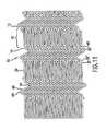 - In the embodiment ofFig. 8, which is shown substantially in the delivery configuration, thefoot extensions 40 are disposed only on one longitudinal side of eachannular element 10. Preferably, all the foot extensions extend in the same longitudinal and circumferential directions. It is noted thatconnection locations 50 are evenly spaced circumferentially, with twounconnected apices 30 between circumferentially adjacent connection locations. Eachconnection location 50 includes afoot extension 40 on oneannular element 10 and an apex 30 on the adjacentannular element 10. Furthermore, theconnection locations 50 between adjacentannular elements 10 are circumferentially offset from one set of connected annular elements to the next.