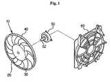 - Typically, theaxial flow fan 10 is made of synthetic resin and formed as a single body. To efficiently guide air blown by theaxial flow fan 10 to a heat exchanger, theaxial flow fan 10 is assembled with ashroud 60 which is mounted to the heat exchanger. Theshroud 60 to guide blown air includes a blast port having a predetermined size such that theaxial flow fan 10 may be rotatably inserted into theshroud 60. Theshroud 60 has a structure capable of supporting therein themotor 50 which is the drive unit.