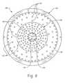 - Figure 8 illustrates a plan view of thelower baffle plate 104 in accordance with another embodiment. There, the density of theapertures 122 increases as one transitions from the center point of thelower baffle plate 104 to the outer edge, wherein the sizes of the apertures are the same.