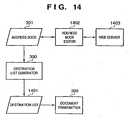 - InFig. 13, a document-transmissionprogram execution file 1203 and itsrelated data 1204 are stored in the storage medium (FD) 212 and loaded via the FD drive 204 onto a computer system 1300. When theFD 212 is inserted into the FD drive 204, the document-transmissionprogram execution file 1203 and therelated data 1204 are read from theFD 212 and loaded onto theRAM 203 and become operative under the control of anOS 1102 and a basic I/O program 1101.