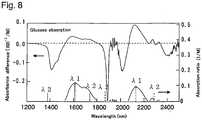 - About two-thirds of a human body or an animal body is made of water, and water occupies near 80% in the blood constituent, while a water molecule exhibits significant absorption of lights having wavelength longer than 1 µm. On the other hand, a glucose molecule exhibits the absorption characteristics in the light wavelength bands near 1.6 µm and 2.1 µm. In a concentration ranging from 50 to 100 mg/dl (2.8 to 5.6 mM) which is the blood sugar level of a healthy subject, water has the absorption 1000 times larger than glucose. Accordingly, in order to measure the blood sugar level, it is necessary that the measurement is performed with an accuracy higher than 0.1%. Usually the accuracy of 5 mg/dl (0.28 mM) is required for the blood sugar level measurement, so the necessary accuracy is estimated to be ca. 0.003%. Thus, the extremely high measurement accuracy is required in order to measure the blood constituent concentration, particularly in order to measure the blood sugar level, i.e., the glucose amount.