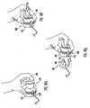 - In accordance with one aspect of the invention, theplunger head 32 additionally includes a safety lock mechanism in the form of a pair ofsafety lock arms 94 pivotally carried innarrow slots 96 formed in theplunger head 32. These safety lockarms 94 have rearward ends connected to thehead 30 bypivot pins 98, and forward ends defining contouredlock fingers 100 which protrude into theplunger head recess 44. As shown in Fig. 7, thesafety lock arms 94 and their associatedlock fingers 100 have a size and shape so that thefingers 100 can engage and retain thehub 18 of the insertion set 14, for example, by fitting into arecess 101 defined between thehub 18 andhousing 20 of the insertion set. Importantly, the locations of the lock arm pivot points are chosen to insure that thelock arms 94 engage and retain the insertion set 14 whenever theplunger 30 is moved from the advanced position (Fig. 7) toward and to the retracted position (Fig. 9). When theplunger 30 reaches the fully advanced position, thesafety lock arms 94 including their respective pivot pins 98 are disposed within thewide cut outs 40 and are therefore free to swing outwardly, relative to the insertion set 14, to accommodate separation of the insertion set from theinjector 10 with a substantially minimum separation force. This configuration has been found to be highly effective as a safeguard to prevent the insertion set 14 from being thrown as a projectile from theinjector 10, in the event that thetrigger assembly 34 is activated without prior placement of theinjector 10 firmly against the patient'sskin 16. In use, the subcutaneous insertion set 14 can be placed quickly and easily into the open nose end of theinjector barrel 28, within therecess 44 formed in theplunger head 32. Such assembly of the insertion set 14 with theinjector 10 requires simple alignment of thebase wings 24 andinfusion tubing 22 with the appropriate cut outs andslots 40, 42 formed in the nose end of thebarrel 28. The insertion set 14 andplunger 30 can then be manually retracted rearwardly, against thedrive spring 36, to the retracted position with theplunger 30 cocked and latched as viewed in Figs. 9 and 11. Theinjector 10 can then be placed firmly against the patient'sskin 16, with the insertion set 14 supported in the proper orientation and at a predetermined distance from theskin 16. Simple depression of thetrigger button 38 releases the cockedplunger 30 for spring-loaded travel rapidly albeit with a controlled speed and force of insertion, to ensure penetration of the patient's skin with minimal discomfort, and in a manner which properly places the insertion needle and cannula. Thesafety lock arms 94 prevent accidental projection of the insertion set 14 through free space, in the event that thetrigger button 38 is prematurely depressed. When the insertion set 14 is properly placed, however, thesafety lock arms 94 release from the insertion set with minimal force, for easy separation of theinjector 10 from the insertion set 14.