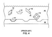 - After therecessed regions 30 have been formed, individual RFID chips are placed in therecessed regions 30 by hand or by a robot (similar to as described above). Alternatively, the RFID chips are assembled into the recessed regions using a process known as fluidic self-assembly (FSA). As illustrated in FIG. 4, the FSA process involves flowing aslurry 40 containingnumerous RFID chips 42 over the surface of thestrap substrate 34 having therecessed regions 30. Gravity pulls the RFID chips into therecessed regions 30. As shown in FIG. 4,edges 44 of theRFID chips 42 may be beveled so that they more easily fall into therecessed regions 30 with the correct orientation.
