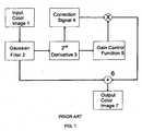 - Another example of colour transient improvement is disclosed in US-A-2003/0107678- . The method of this prior art is shown schematically in Figure 1- . An input chrominance signal-  1 is passed through a Gaussian filter-  2 to remove noise. Then a second derivative with respect to time is taken 3. Using the sign of the second derivative, a correction signal-  4 is created. In particular, the sign of the second derivative determines if the correction signal-  4 is derived from a local minimum or a local maximum of the chrominance signal. The absolute value of the second derivative is used in a gain control generator-  5 to generate a gain control function accordingly. Then, using the correction signal and the gain control function, a chrominance adjustment signal is added to the filtered original chrominance signal in an adder-  6 to generate the final output chrominance signal-  7. A particular problem with the method of US-A-2003/0107678-  is its use of and reliance on the second derivative of the original chrominance signal. This means that in the case that transitions in the chrominance signal are linear, no changes to the chrominance signal will be effected by this prior art method. Moreover, the enhanced colour transitions are still sometimes not aligned with the luminance edges and, in fact, the hue change artefacts around the edges can be made even more visible using this prior art method.