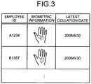- Theupdate managing unit 208 monitors the latest collation dates in the biometric information local DB stored in the biometricinformation storing unit 202. Theupdate managing unit 208 deletes data from the biometric information local DB. The data has a latest collation date since which a predetermined period has elapsed. When notification of the performance of the first collation is given from thefirst collation unit 203, theupdate managing unit 208 updates the latest collation date of the subject employee in the biometric information local DB to the current date. Furthermore, theupdate managing unit 208 newly registers the employee ID and the biometric information outputted from the collationresult judging unit 207 to the biometric information local DB.