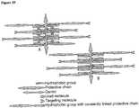 - In a further embodiment described herein are any of the aforementioned compositions, wherein the hydrophobic group comprises an alkyl group. In a further embodiment, the alkyl group comprises a branched alkyl group. In a further embodiment, the alkyl group comprises a double bond. In a further embodiment, the alkyl group comprises an ethyl or propyl group. In a further embodiment, the alkyl group is a butyl, pentyl, or hexyl group. In a further embodiment, the alkyl group is CH3(CH2)nCH2-, CH3(CH2)nCH2NH-, CH3(CH2)nCO-, CH3(CH2)nCH2O-, CH3(CH2)nCH2S-, -OC(CH2)nCH2-, -OC(CH2)nCH2NH-, -OC(CH2)nCO-, -OC(CH2)nCH2O-,-OC(CH2)nCH2S-, -HNC(CH2)nCH2-, -HNC(CH2)nCH2NH-, -HNC(CH2)nCO-,-HNC(CH2)nCH2O-, -HNC(CH2)nCH2S-, -OCH2(CH2)nCH2-, -OCH2(CH2)nCH2NH-, -OCH2 (CH2)nCO-, -OCH2(CH2)nCH2O-, or -OCH2(CH2)nCH2S- group; wherein "n" is 4-34, inclusive. In a further embodiment described herein are the aforementioned compositions with hydrophobic chain covalently linked to protective side chains, wherein the hydrophobic chain with covalently attached protective side chain is independently selected from the group consisting of-(CH2)4NHCO(CH2)nOC-A-OR3, -(CH2)4NHCO(CH2)nNHCO(CH2)yCO-A-OR3,-CH2OOC(CH2)nOC-A-OR3, -CH2OOC(CH2)nNHCO(CH2)yCO-A-OR3,-CH(CH3)OOC(CH2)nOC-A-OR3, -CH(CH3)OOC(CH2)nNHCO(CH2)yCO-A-OR3,-CH2COOC(CH2)nCO-A-OR3, -CH2COOC(CH2)nNHCO(CH2)yCO-A-OR3,-CH2CONH(CH2)nNHCOCH2CH2-A-OR3, -CH2CONH(CH2)nNHCO(CH2)yCO-A-OR3,-(CH2)2COOC(CH2)nCO-A-OR3, -(CH2)2COOC(CH2)nNHCO(CH2)yCO-A-OR3,-(CH2)2CONH(CH2)nNHCOCH2CH2-A-OR3, -(CH2)2CONH(CH2)nNHCO(CH2)yCO-A-OR3,-(C6H4)OCO(CH2)nCO-A-OR3, and -(C6H4)OCO(CH2)nNHCO(CH2)yCO-A-OR3, wherein n is 2-22; y is 2-6; R3 is H, (CH2)pCH3 or (CH2)pCOOH, wherein p is 0-7; and A is [OCH2CH2]x or [OCHCH3CH2]x, wherein x is 17-250, or various combinations of [OCH2CH2] and [OCHCH3CH2] with a total of 17-250 units. In another embodiment, the hydrophobic group comprises an aromatic ring compound. In a further embodiment, the aromatic ring is phenyl. In a further embodiment, the aromatic ring is naphthyl. In a further embodiment, the aromatic ring compound is cholesterol. In a further embodiment, the aromatic ring compound is fluorescien and the carboxyl group in fluorescien will act as orienting molecule.