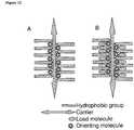 - Figure 12 depicts a diagram of two embodiments of the hydrophobic-core composition of the present invention comprising a carrier, a hydrophobic group, an orienting molecule, with (B) and without (A) load molecule.