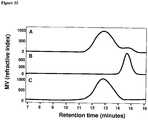 - Figure 32. These are Gel Filtration Chromatograms of the products of the reaction before and after clean up through 100 kDa MWCO membrane (Amersham Biosciences, Needham, MA) showing that all unreacted PEG had been removed. The column used was Ultrahydrogel linear (0.78x30 cm, Waters) eluted at flow rate of 0.6 ml/min PBS. The materials were detected using refractive index detector. Panel A is 20PLPEG5-55 (20 kDa polylysine where 55% of the amino groups were reacted with PEG succinate of 5 kDa molecular weight) prior to clean-up from unreacted 5 kDa PEG. Panel B is 5 kDa PEG alone. Panel C is 20PLPEG5-55 after clean up.