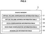 - Fig. 3 shows an example of the various tables stored in the sharedmemory 9. The sharedmemory 9 is configured from a virtual VOL configuration information table 21 for managing the configuration information of thevirtual volume 16, a virtual VOL address information table 22 for managing the address information of thevirtual volume 16, an ECCG configuration information table 23 for managing the configuration information of the ECCG in thepool area 18, an ECCG page configuration information table 24 for managing the configuration information of pages in theECC group 14, and an access log information table 25 for managing the access log of pages in theECC group 14.