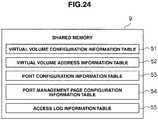 - Fig. 24 shows an example of the various tables stored in the sharedmemory 9 in the second embodiment. The sharedmemory 9 is configured from a virtual VOL configuration information table 51, a virtual VOL address information table 52, a port configuration information table 53 for managing the configuration information of theports 7, a port management page configuration information table 54 for managing the configuration information of pages managed by theports 7, and an access log information table 25 for managing the access log of pages managed by theports 7.