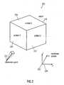 It should be noted here that thecube 210, which is also designated as "cube1" comprises a total of six surfaces, three of which are shown here. For example, thecube 210 comprises afirst surface 230, asecond surface 232 and athird surface 234. Furthermore, it should be noted that a preferred point within the cube and a preferred direction within the cube may be defined in order to describe a location and an orientation of the cube. For example, the position and orientation of the cube may be described in terms of a position of the center (or point of gravity) of thecube 210 and a preferred direction of thecube 210. The preferred direction may, for example, be a direction being normal on thefirst surface 230, pointing outward from thefirst surface 230. Consequently, a position of thecube 210 may be described by three scalar coordinates (e.g. coordinates x, y, z) indicating the position of the cube with respect to anorigin 222 of the coordinatesystem 220. Furthermore, two additional coordinates (e.g. 2 angle coordinates φ, θ) may be used to define the preferred direction or the orientation of thecube 210.