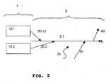 Die eingekoppelten Arbeitsstrahlen 20.1 und 20.2 verlaufen weiter bei der Stelle in der optischen Faser 2.1 vorbei, wo später ein Pilotstrahl 30 zur Unterstützung der ophthalmologischen Anwendung eingekoppelt werden kann, laufen anschließend bei der Stelle in der optischen Faser 2.1 vorbei, wo eine Leistungsüberwachung 40 angeschlossen ist und wo die Energie und Leistung der Arbeitsstrahlen überwacht werden kann.The coupled working beams 20.1 and 20.2 continue to pass the point in the optical fiber 2.1, where later a
