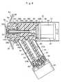 - Indicated at 42 is a paint cartridge which supplies paint to therotary atomizing head 34. Thispaint cartridge 42 is largely constituted by an axially extending tubular (cylindrical)container 43, afeed tube 44 axially extending from thecontainer 43, and a piston defining a paint chamber and an extending liquid chamber (both not shown) within thecontainer 43.