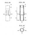 When left as they are, that is, when in a state in which no external force is being imparted thereto, theskirt portions 38 are diverged in a skirt-like fashion as illustrated infig. 3A. At this time, the interior of thefirst region 32 of the retainingportion 42 forms a columnar space as illustrated inFIG. 3B. When loading the connection rings 14 into thesheath 16, the following takes place: in the case, for example, of thesecond connection ring 14B illustrated inFIG. 1B, theskirt portions 38 are pushed in to enter the internal space, and the inner peripheral side portions of theskirt portions 38 pressurize the side surface (edge portion) of the turnedportion 24 of theclip 12B retained by thefirst region 32, thus retaining theclip 12B such that it does not move in the rotating direction and the advancing/retreating direction within theconnection ring 14B. It is also possible for theskirt portions 38 to pressurize and retain the clip retained by thesecond region 34, that is, the succeeding clip.
