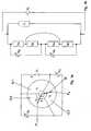 Die beiden Segmente 12.1, 12.2 bilden eine kreisringförmige Anordnung, in deren Mittelpunkt M eine Verbindungsvorrichtung 38 drehbar um den Mittelpunkt M gelagert ist. Die Verbindungsvorrichtung 38 weist einen ersten Arm 40, einen zweiten Arm 42 und einen dritten Arm 44 auf, die an ihrem dem Mittelpunkt M abgewandten Ende in einem ersten Kontaktpunkt P1, in einem zweiten P2 bzw. in einem dritten Kontaktpunkt P3 in elektrischem Kontakt mit dem jeweiligen Segment stehen. Auf diese Weise werden Schleifkontakte gebildet.The two segments 12.1, 12.2 form an annular arrangement, in the center of which M a connecting
