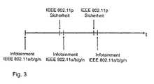 Gemäß einer anderen Ausgestaltung kann die Umschaltung zwischen dem ersten Modus nach dem IEEE802.11p-Standard und dem zweiten Modus nach einem anderen IEEE802.11-Standard auch nach vorgegebenen Zeitabständen erfolgen. Hierdurch werden bestimmte Zeitschlitze (Slots) definiert, in welchen die IEEE802.11p-Übertragung von Sicherheitsinformationen möglich ist. Während der übrigen Zeiten können dann Infotainment-Anwendungen übertragen werden, auch unabhängig davon, ob das Fahrzeug bewegt wird oder nicht. Diese Kombination der Übertragung kann auch mit der vorher beschriebenen Umschaltung in Abhängigkeit des Fahrzeugzustands kombiniert werden, beispielsweise um auch bei einem stehenden und nicht am Fahrbetrieb teilnehmenden Fahrzeug regelmäßig Sicherheitsinformationen zu erhalten.According to another embodiment, the switching between the first mode according to the IEEE802.11p standard and the second mode according to another IEEE802.11 standard can also take place after predetermined time intervals. As a result, certain time slots are defined in which the IEEE802.11p transmission of security information is possible. During the rest of the time, infotainment applications can then be transmitted, regardless of whether the vehicle is being moved or not. This combination of the transmission can also be combined with the previously described switching as a function of the vehicle state, for example, in order to obtain regular safety information even in the case of a stationary and non-driving vehicle.