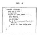 - FIG. 13A is a syntax example of a table indicating the information for variable-speed playback. In the syntax, num_pic_in_RAU shows the number of AUs that constitute a random access unit RAU, num_speed shows the number of playback speeds at which AUs to be decoded, play_speed shows a playback speed, num_dec_pic shows the number of AUs to be decoded at the time of playing back at a playback speed shown in the play_speed, dec_pic shows the ordinal numbers of AUs to be decoded in the case of counting the AUs starting with the top AU in a random access unit RAU.FIG. 13B is an example in the case of storing information on AUs to be decoded in a random access unit RAU shown inFIG. 9A to 9D at the time of double-speed playback and quadruple-speed playback. Note that num_pic_in_RAU is used at the time of calculating an exact playback speed based on the number of AUs to be decoded and the total number of AUs in a random access unit RAU or skipping on a basis of random access unit RAUs in sequence. However, num_pic_in_RAU may be omitted because the same information can be obtained by searching the top AUs of random access unit RAUs. Also, a field indicating the size of a table may be added to the table. Note that, in the syntax example ofFIG. 13A, the ordinal number of an AU to be decoded, counting from the top of a random access unit RAU, is directly shown, but whether there is a need to decode each AU or not may be shown by turning on or off the bits corresponding to each AU. For example, a random access unit RAU is composed of 16 AUs in the example ofFIG. 9A to 9D, 16 bits are needed when assigning 1 bit to one AU. At the time of quadruple-speed playback, it is shown that the first, fifth, ninth and thirteenth AUs are decoded by assigning 16 bit information that is represented as 0b1000100010001000 (0b shows a binary number). Here, the top bit and the fast bit correspond to the top AU and the last AU of a random access unit RAU respectively.